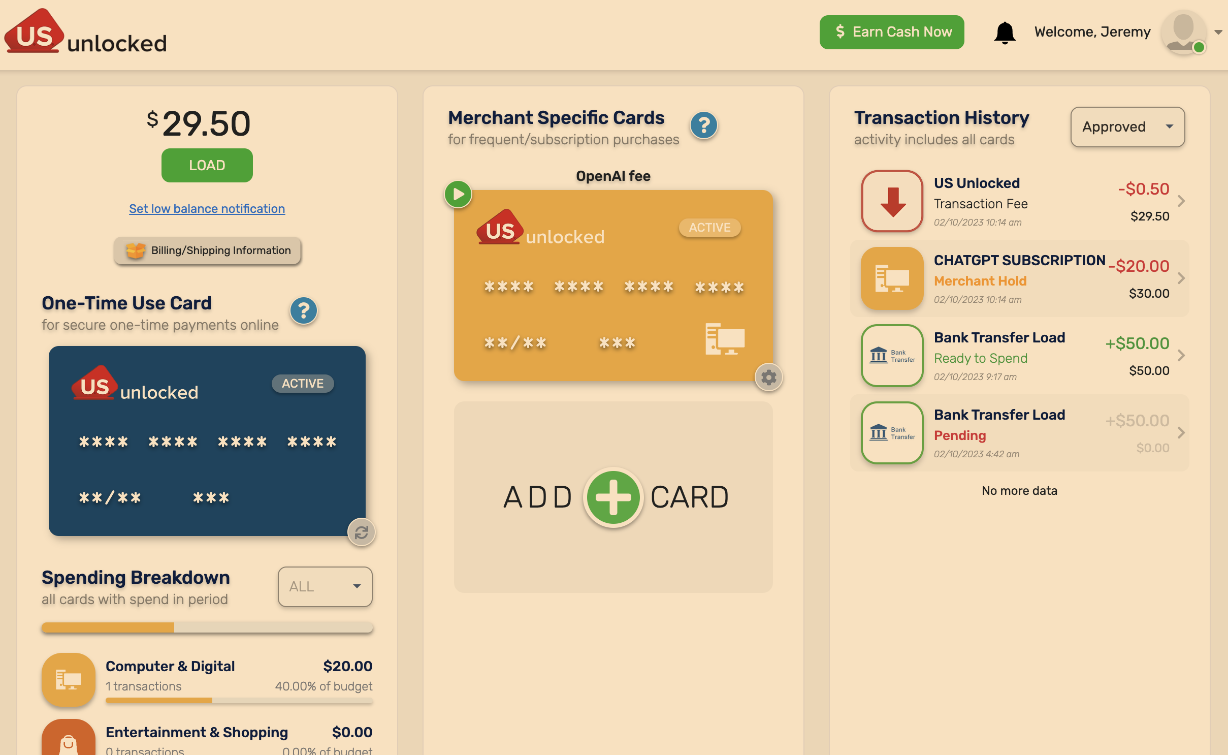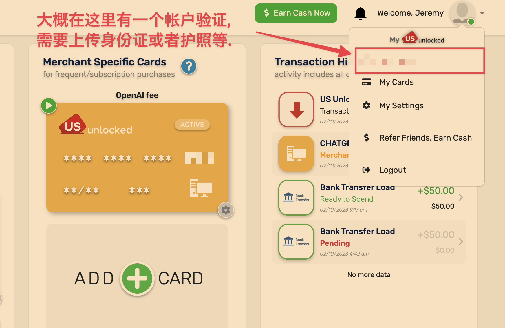 在usunlocked的Merchant Specific Cards选项, 点击任意的星号, 进行虚拟信用卡激活.