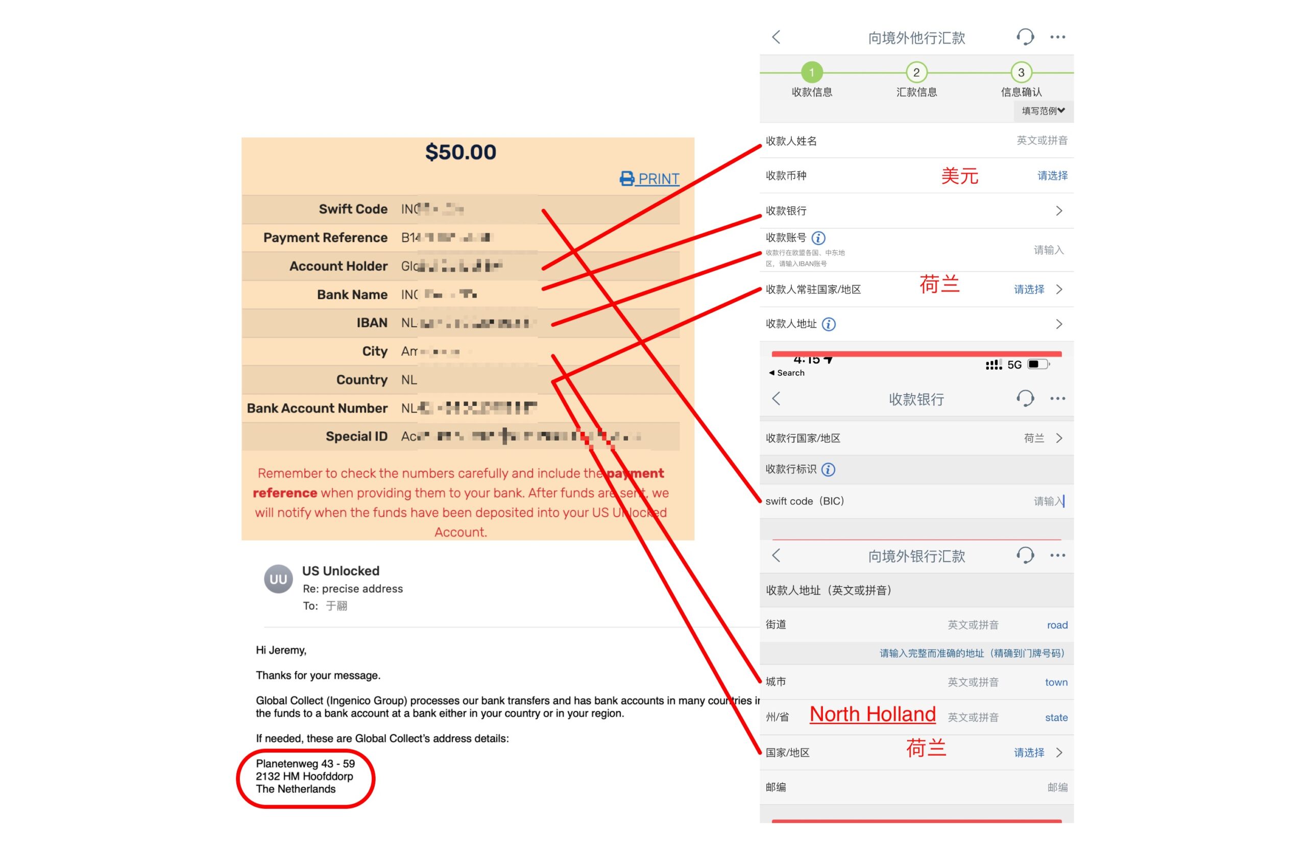 不过国内信息汇款需要详细到街道, 而usunlocked提供的收款银行并没有街道信息, 我发电邮询问后告诉我详细信息如下: