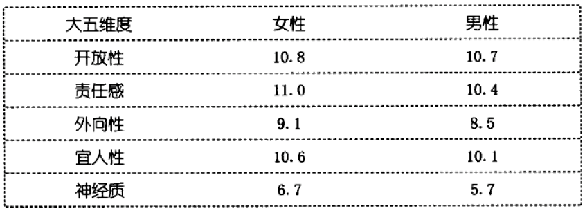 人格的大五维度,即OCEAN,开放性openness(想象力,艺术口味,情感,冒险精神,智力,心理开放度等),责任感conscientiousness(自我效能,秩序化,忠诚,追求成就,自律,谨慎),外向性extraversion(友善,社交,支配,活跃,寻求刺激,兴高采烈),宜人性agreeableness(信任,道德感,利他主义,合作,谦逊,同情心),神经质neuroticism(焦虑,发怒,自我意识,无节制,脆弱),需要注意的,第个人格信度项下都有好几项小分类,虽然这些小分类有较高的相关性,但并不一定,比如,虽然乐于接受新事物,艺术鉴赏力高的人往往比较注重个人感情,但本书作者就是个例外