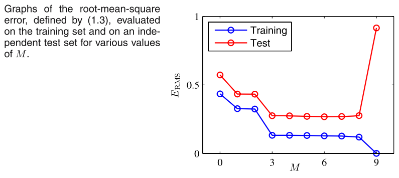假设我们现在需要进行模型选择,也就是说,在多项式模型的模型空间中,选择一个M阶多项式作为我们最后的模型,那么