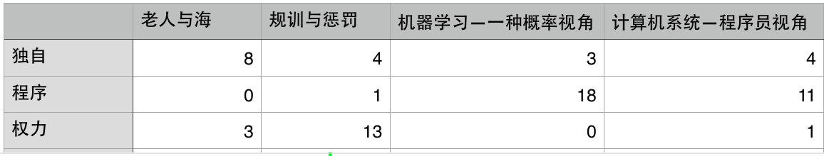 假设你现在到了一个图书馆, 你看到四本书, \<老人与海>, \<规训与惩罚, \<机器学习—一种概率视角>, \<计算机系统—程序员视角>, 于是你开始闲得无聊, 数这本书中每个词出现的词, 于是你得出了下面这个矩阵: