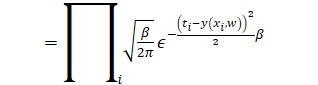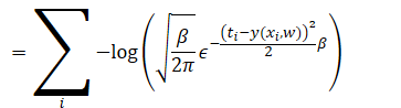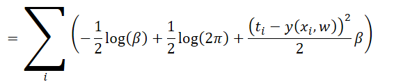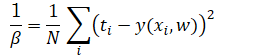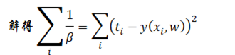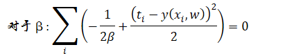 在上式中注意xi和ti是书籍量,我们的目标是求上式的极佳,上式是关于β和w的函数分别对于这个未知量求导,并令其为零。