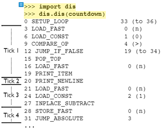首先来谈这个tick,这个tick其实是一定的步数的字节码,如果使用python提供的反汇编模块dis.dis来对python代码进行反汇编将之转变成机器码的话,可以看到
