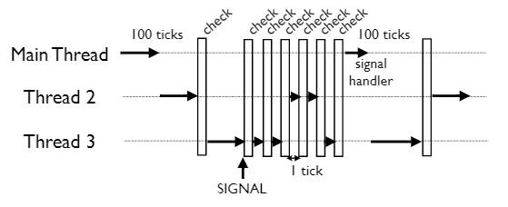 如前所述,只有主线程中实现了线程处理函数,可以处理系统广播的信号,而在线程三的这一次运行中,当线程3接收到系统传递过来的信号后,线程3不再等100个tick才去检查,并释放gil,而是每过一个tick都进行一次检查,这样实现的目的是为了尽快地能够将执行转移给主线程,从而能够尽快地响应系统的发出的信号。