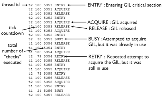 作者dabeaz(python cookbook一书的作者)很强大,下载了python的源码之后,修改了其gil的运行机制,使得python在运行中,对gil的状态进行了记录,并在退出运行时dump内存到硬盘上,记录的格式如下所示: