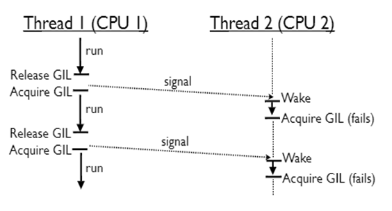 这样的结果,就是,线程B获得了系统的调试,但是却没有获得gil锁,于是就不断地试图地抢夺gil锁,而线程A一直拿着锁不给线程A,线程A过段时间释放次gil,也很快地被系统调度再次运行从而很快地利获得gil锁,线程B于是一直被唤醒,抢夺,得不到,再次阻塞。。。。