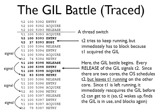 在运行check,进行gil锁的释放后,操作系统会调试那个线程来运行,并不是python来决定的,于是当存在挂起线程的情况下,python解释能够做的惟一的事情,就是频繁地切换线程,从而期待主线程能够运行并处理挂起的信号。