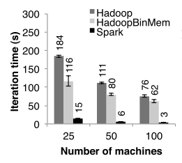 | spark的设计者Matei Zaharia等人在亚马逊云计算平台EC2上做了实验,在4核心15G内存、使用HDFS分布式文件系统的运行环境中,Zaharia运行了逻辑回归这样的迭代任务,spark的表现比Hadoop要快25倍左右。而根据作者说在生产环境中,spark更是要快上40倍。 |